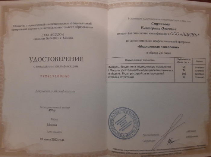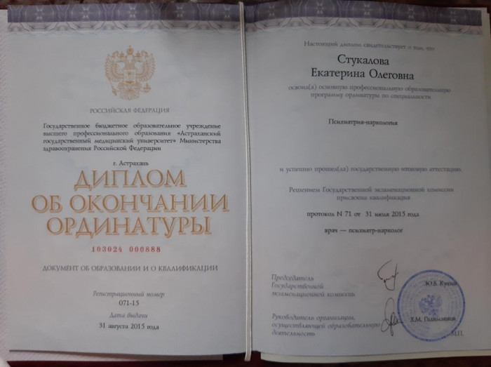 Психиатр-нарколог Екатерина Олеговна Стукалова специализируется на лечении игровой, никотиновой, алкогольной, компьютерной (интернет), наркотической зависимости с применением различных методик. Также проводит диагностику и лечение апатии, депрессии, неконтролируемой агрессии, булимии, анорексии, панических расстройств, страхов и фобий и других психических расстройств.